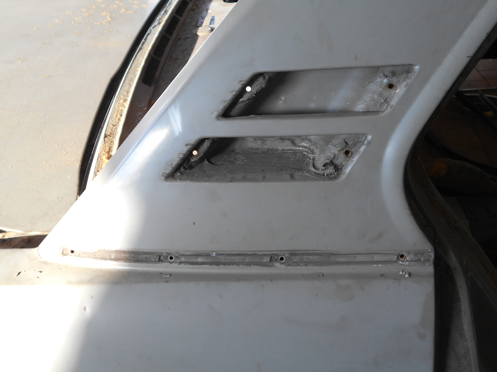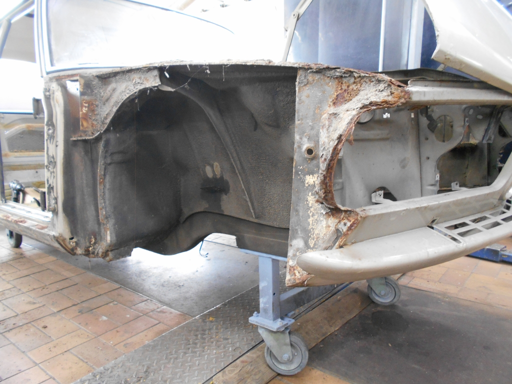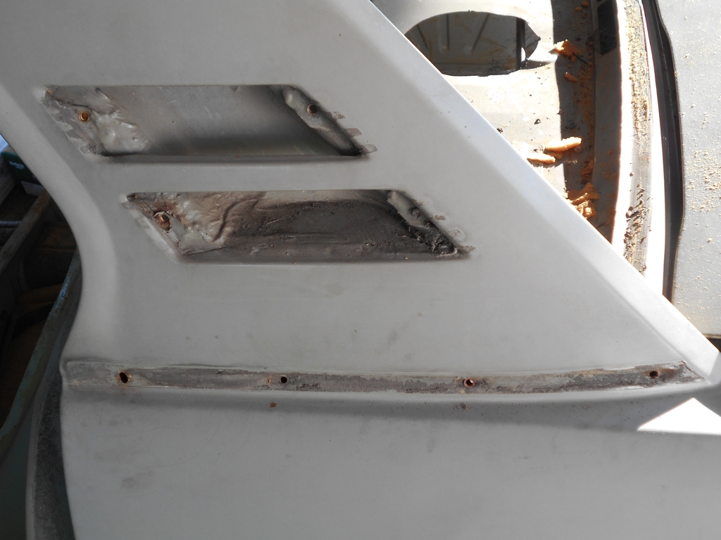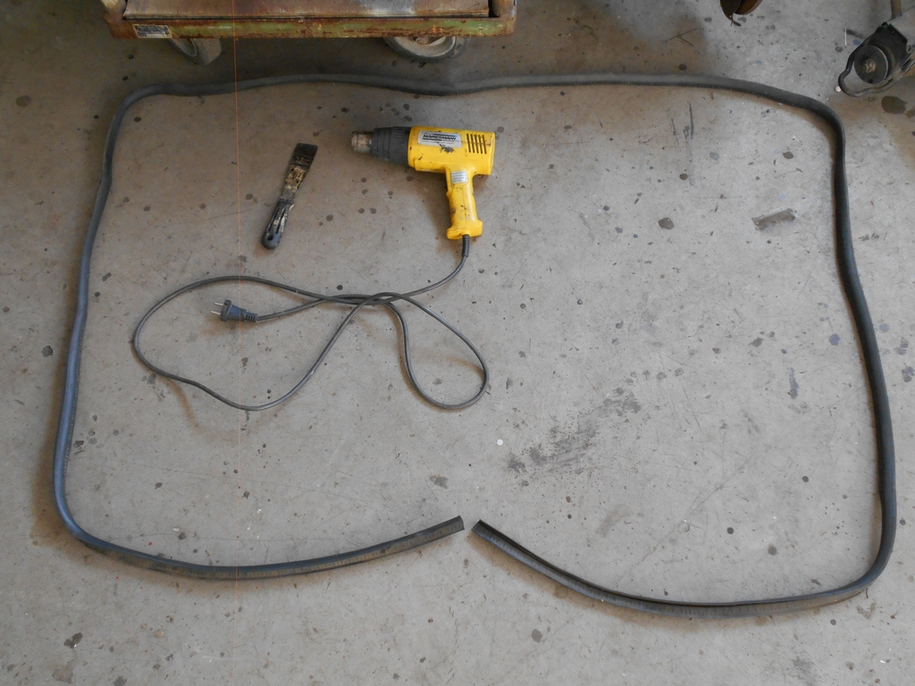 Dachsäule hinten, Fahrerseite. Der schmutzige Streifen markiert die Position der Leiste. Unter der Leiste befand sich, jetzt sichtbar, eine ebene Oberfläche. Alle Stöße und Aussparungen der überlappenden Bleche wurden verzinnt und geglättet. Dachsäule hinten, Beifahrerseite. Während des Karosseriebaus wurde auf beiden Fahrzeugseiten parallel gearbeitet, mit durchaus unterschiedlichem Ergebnis. Die Kante des außenliegenden oberen Blechs und die Aussparungen um die Befestigungslöcher für die Leiste sind gut zu erkennen. Hier wurde nichts verzinnt. Grund zur Freude: Die Kofferraumdeckeldichtung ließ sich am Stück entnehmen und kann wohl wiederverwendet werden. Nötig waren Fön, Spachtel und Geduld (letztere nicht abgebildet). Gut erhaltene alte Dichtungen sind Wertgegenstände. Man sagt, sie seien Nachfertigungen in fast allen Belangen überlegen. Bald geht es weiter.