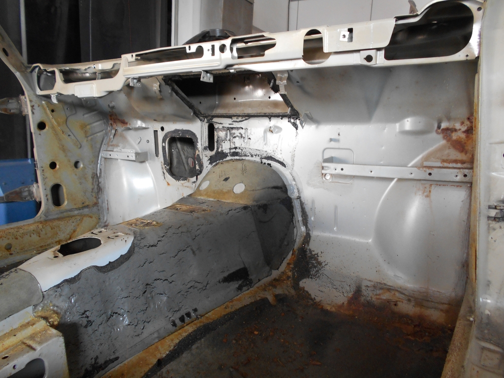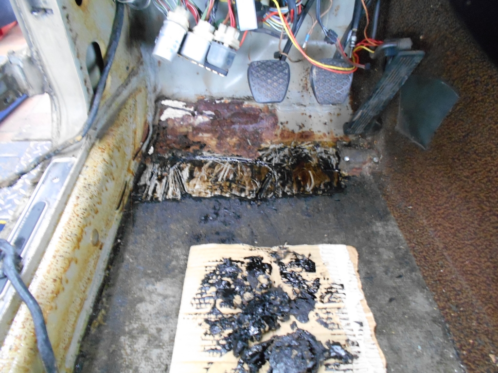 Ecke vorne rechts. Das Radhaus ist erstaunlich gut. Der Kotflügel ist nicht mehr zu verwenden. Auch das Spritzblech ist hin, hat aber die A-Säule gut geschützt. Vom Lampentopf ist mehr übrig als auf der anderen Seite, von der Kotflügelauflage weniger. Kotflügel/A-Säule/Schweller links. Der Kotflügel wurde getauscht und zum Türschweller hin verschweißt. Hier ist die Naht fast vollständig aufgetrennt. Fußraum Fahrer. Abkratzen der Bitumenmasse mit Heißluft und Spachtel gehört vermutlich zu den lebensverkürzenden Maßnahmen. Die großen sehr hellen Stellen im Rost sind Werkstattboden, nur etwas überbelichtet. Bald mehr.