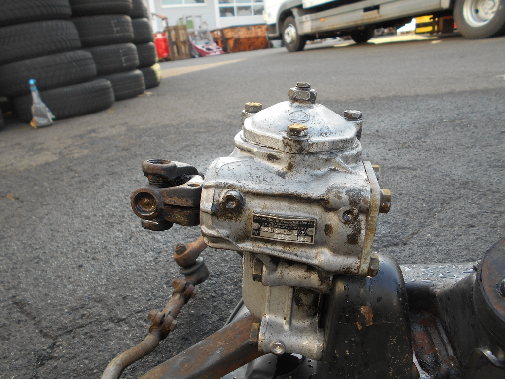 die Hinterachse gehört zu den schweren Einheiten. Das Ärgerliche zuerst und nicht im Bild: Jemand muß das Hinterachsgetriebe getauscht haben. Statt des Lamellen-Selbstsperrdifferentials 3,45 fiel uns ein offenes Ausgleichsgetriebe 3,64 vor die Füße. Offensichtlich eine spätere Ausführung, die Abtriebswellen waren getriebeseitig mit Schrauben ohne Muttern befestigt. Radseitig fand sich die erwartete frühe Version, d.h. Schrauben und Muttern.