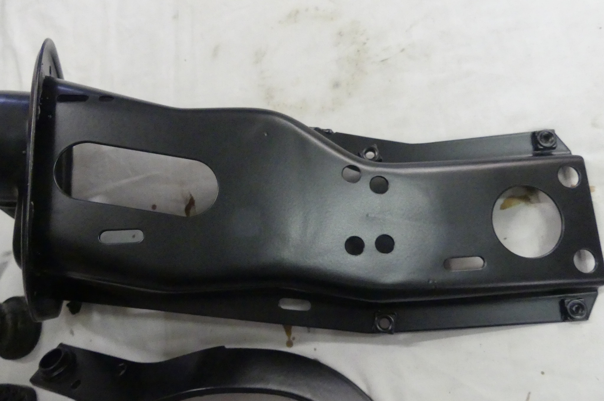 Pedalbock, Ansicht vom Motorraum, oben ist unten. Im Bild oben ist die Gummimanschette um die Lenksäule, an das Loch unten links kommt der Kupplungs-Geberzylinder.