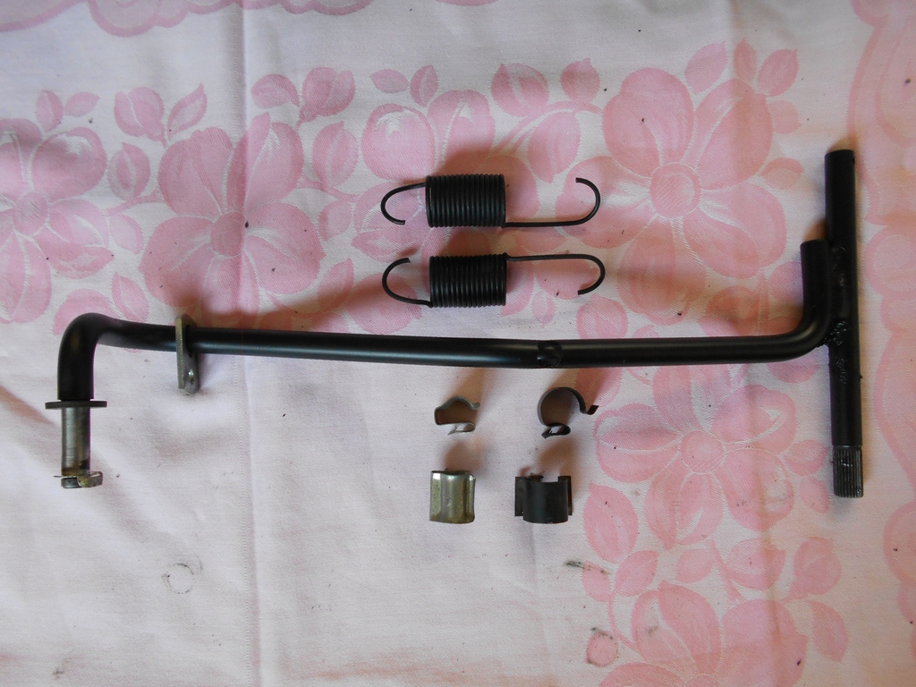 Fahrfußhebel, sichtbare Seite zeigt zum Innenraum, oben ist rechts. Das T-Ende wird in den Pedalbock eingefädelt, auf das andere Ende wird die/das "Fahrfußhebelplatte (Gaspedal)" gesteckt. Oben die beiden Rückzugfedern für Brems- und Kupplungsfußhebel.