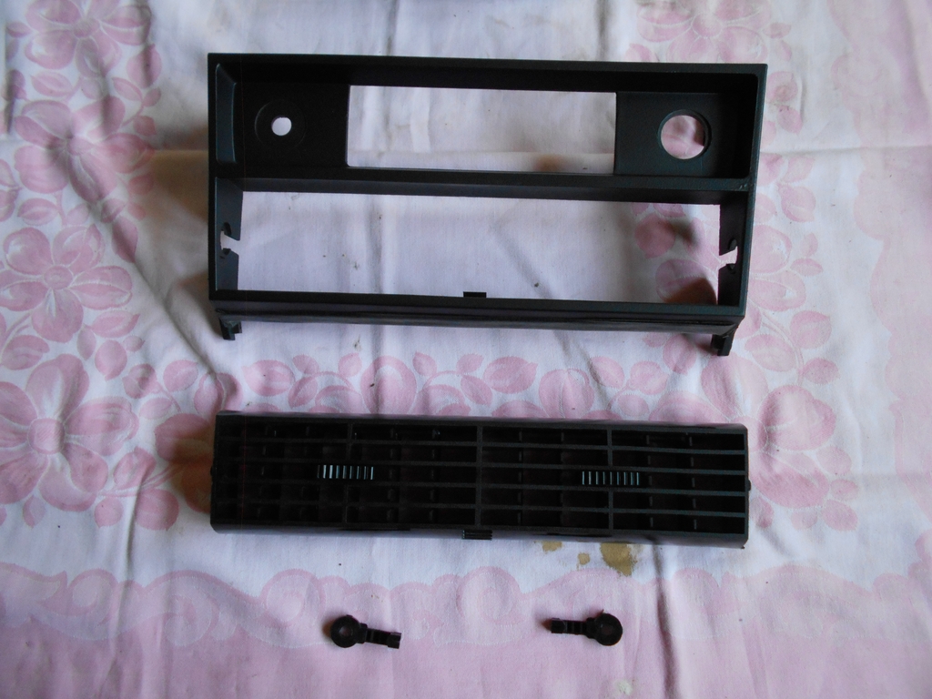 Abdeckung für Frischluftgrill, zerlegt und lackiert. Der Lack war teilweise abgestoßen. Der/Das Frischluftgrill ist zum Lackieren herausgenommen. Ganz unten liegen die Lager des Grills. Wer es nachmachen will: Das Lager auf der Beifahrerseite läßt sich ausheben.