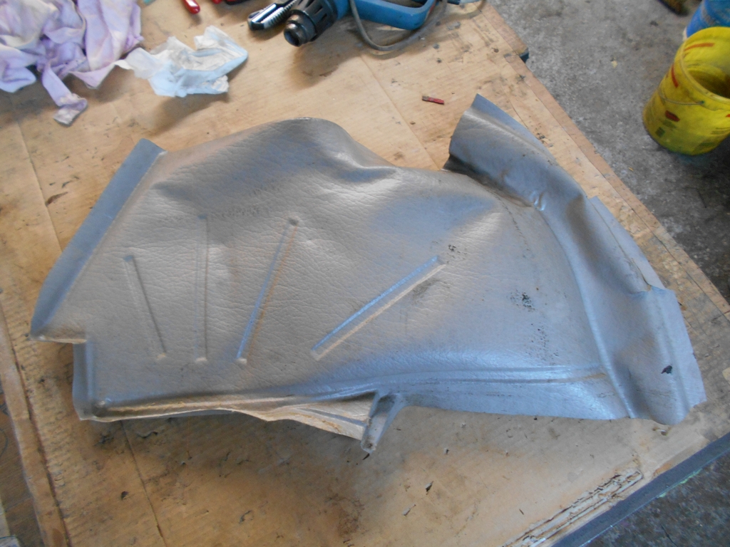 Radhausverkleidung Fahrerseite. sauber. Dieses Teil lag obendrauf, es mußte nur minimal gerichtet werden. Gegen die Risse ist nichts zu machen, kann man aber so nehmen.