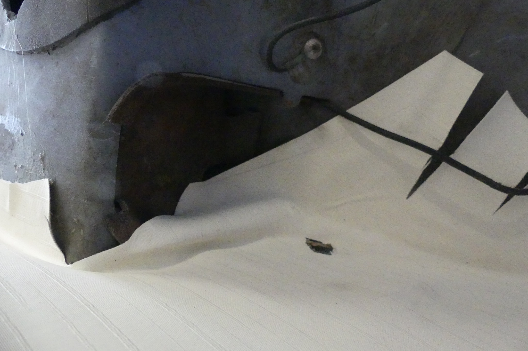 Die aufgeschweisste Mutter in der C Säule für die Umlenkung habe ich gefunden. Hier steckt eine weiße Blindschraube aus Kunststoff drin.