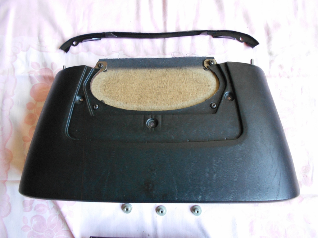 Abdeckung Instrumententräger, Bild von oben, untere Kante zeigt zum Innenraum. Der abnehmbare Deckel über dem Kombiinstrument ist eine Besonderheit der Serie 1 (und aller Rechtslenker). Das Textilgewebe über dem Mono-Lautsprecher hat sich sehr gut gehalten. Das Gitter darüber (nicht im Bild) war wie meistens hellgrau und ist inzwischen lackiert.