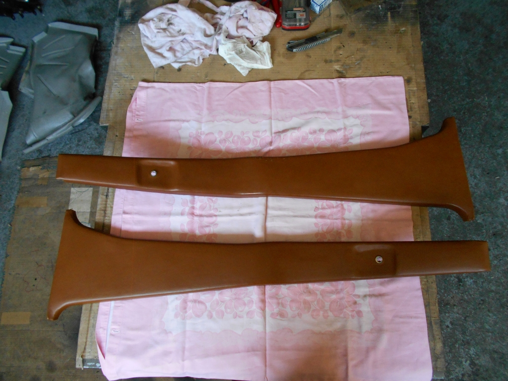 Verkleidungen B-Säule, Beifahrerseite liegt oben. Überraschend massive Bauteile, Ganzmetall mit Kunstleder bespannt. Die nächste Besonderheit früher E3: Das untere (breite) Ende ist geschlossen. Erst ab Serie 2 konnte die Spannrolle von Automatic-Gurten in der Mittelsäule versenkt angebracht werden.