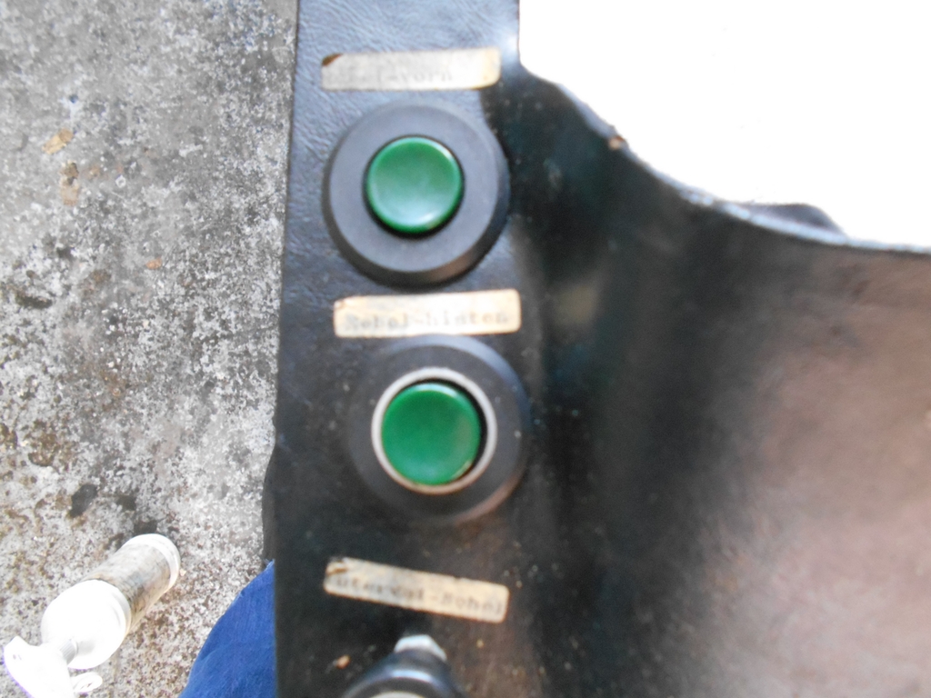 Verkleidung Instrumententafel unten Mitte links. Ein früherer Besitzer hatte offenbar Freude am Basteln. Wir finden hier, von oben nach unten: "Nebel-vorn", "Nebel-hinten" und "Interval-Schei". Rechts der Lenksäule geht es ähnlich zu.
