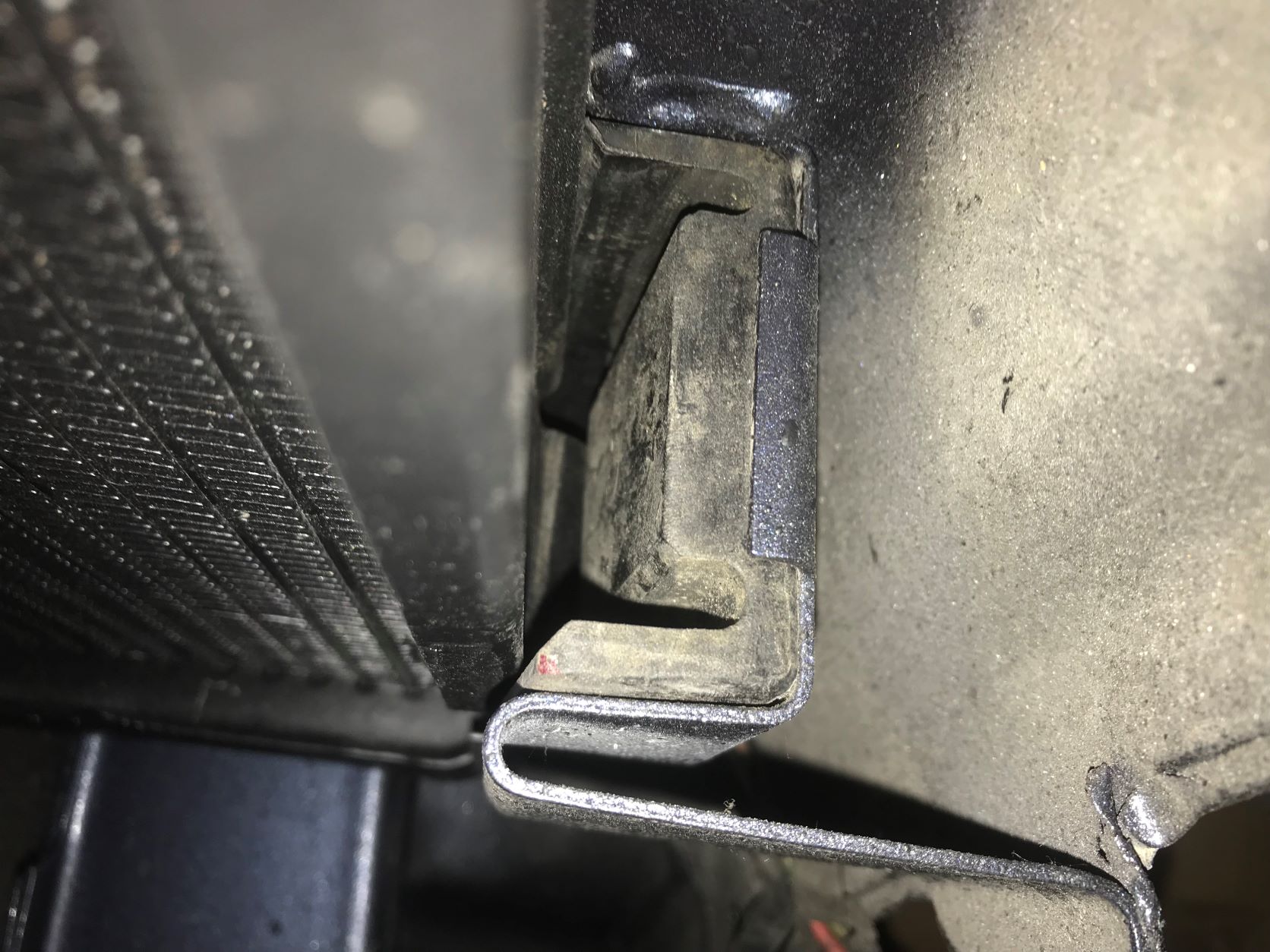 Kühler eingebaut,liegt oben in den seitlichen Gummiaufnahmen auf den Nasen auf,geht nicht mehr tiefer. und so sieht es unten aus.