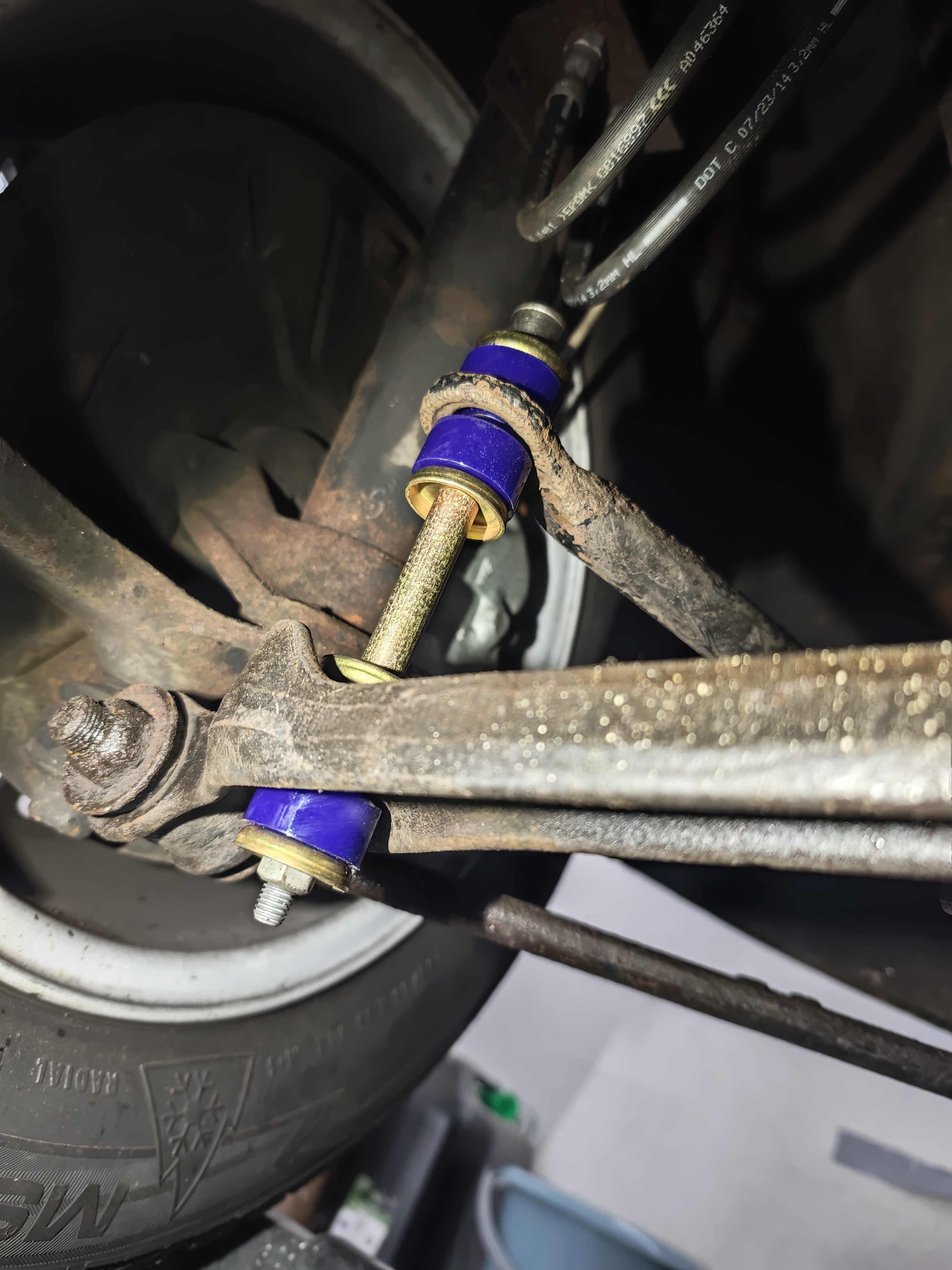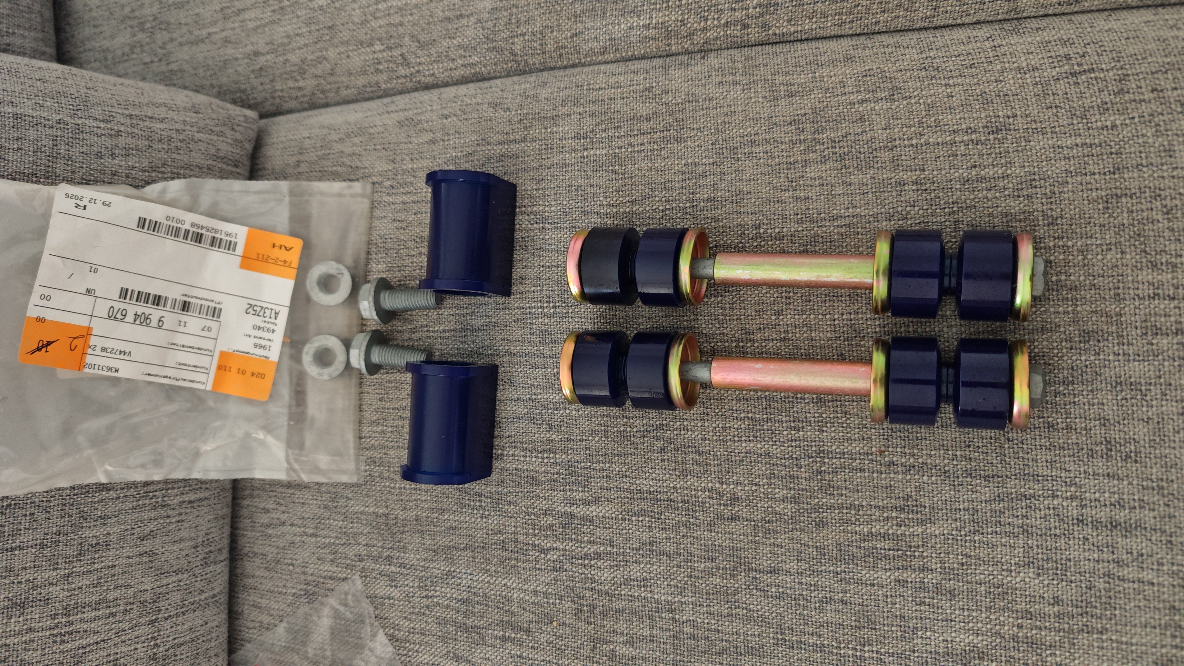 Ein Forumskollege hatte vermutet, dass die mittleren Stabilager nicht passen würden bei den Haltern. Das war tatsächlich so, aber nicht wegen der Breite, sondern die neuen Lager waren am Boden nicht dick genug, sodass sie bei angezogenen Schrauben noch Luft zum Achsträger hatten. Schon ein bisschen ärgerlich. Ich habe jetzt nochmal neue Lager in PU bestellt, welche unten deutlich dicker sind. Diese sollten dann passen. Fühlt sich alles auch wieder richtig gut an, absolut spielfrei, selbst mit den alten Gummilagern in den mittleren Haltern.