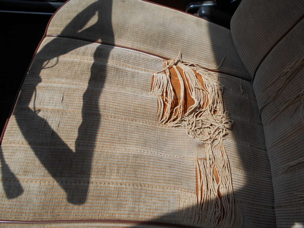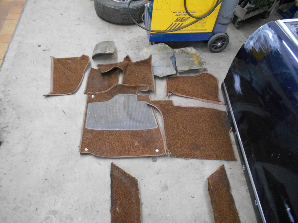 Mittlere Säule, Beifahrerseite. Plötzlich wird klar, weswegen bei frühen E3 die Aufroller der Gurte nicht versenkt montiert sind. Es geht nicht. Daher das Loch im Boden (direkt oberhalb des Pappkartons). An der vorderen Tür ist die Dichtefolie mal ersetzt worden. Hinten klebt noch die originale. Fußraum vorne links, noch mit Dämmung an der Spritzwand. Der Kabelstrang nach hinten liegt wie am ersten Tag. Das grüngraue Zeug auf der Bitumenmatte fühlt sich an wie ein Feuchtigkeitsspeicher. Wahrscheinlich ist es auch einer. Mehrteiliger Teppichsatz, Stücke von vorne, ganz oben die Schaumstoffblöcke aus den Fußräumen. Jede Menge liebevoll zugeschnittene Puzzleteile, die meisten sind schmutzig, aber es sind alle da und halbwegs in Ordnung. Bis demnächst.