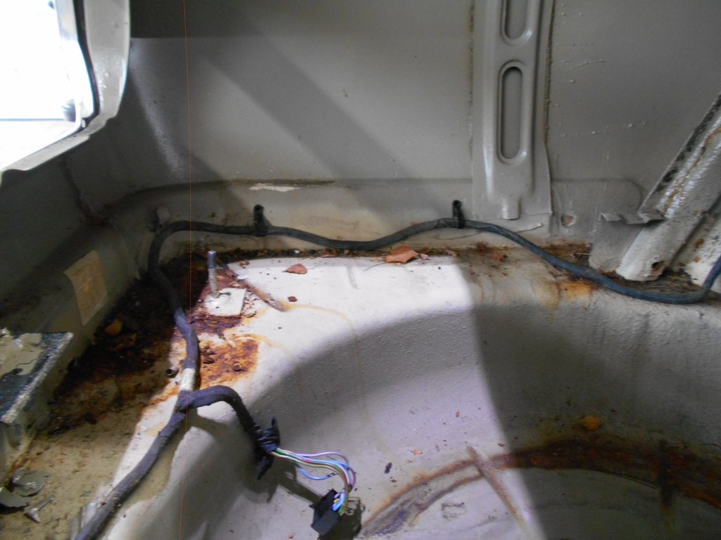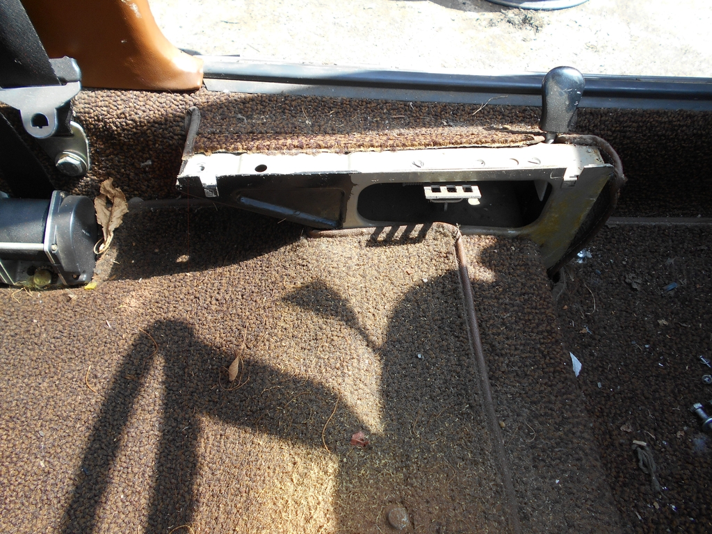 Der Fahrersitz fühlt sich hervorragend an, nur der Bezug ist mäßig. Sitzkonsole Fahrerseite außen. Interessant: Das hintere Ende der Konsole wurde offenbar im Werk schwarz angepinselt. Auch interessant: Die Knöpfe der Teppichmatten hier sind ein anderes Modell als die von 1970 und später. Radhaus hinten rechts. Das ist die schlechtere Seite. Nicht schön, aber geht noch. Die bunten Leitungen stammen von einer nachgerüsteten Kapelle samt elektrischer Antenne. Kommt noch mehr.