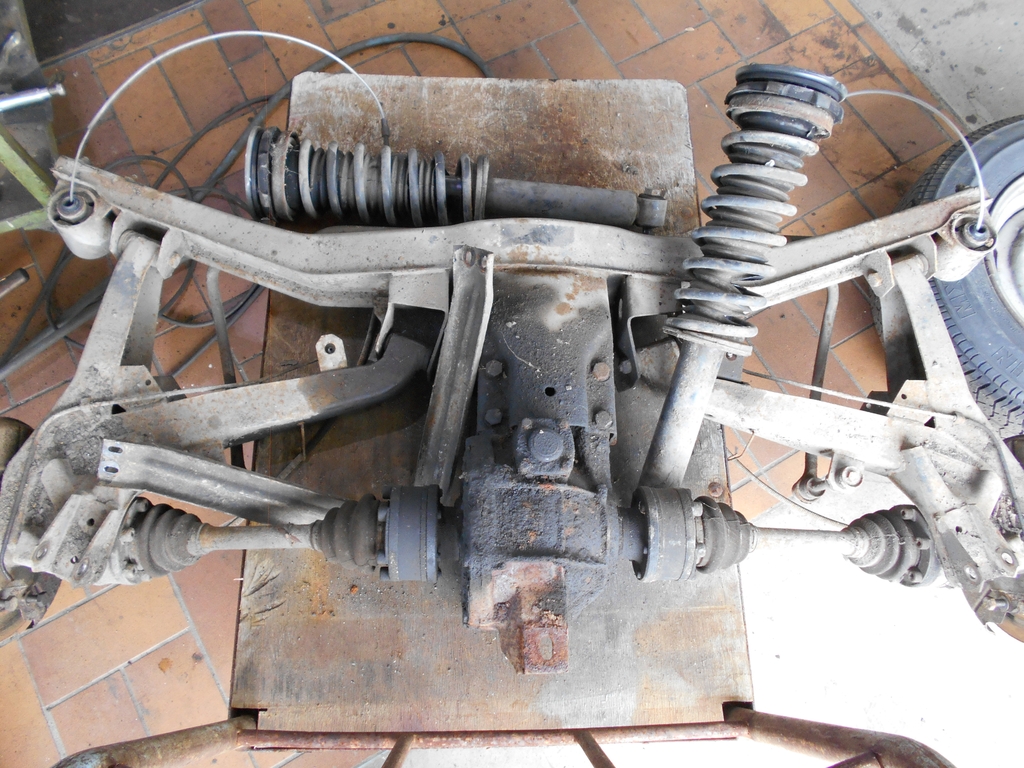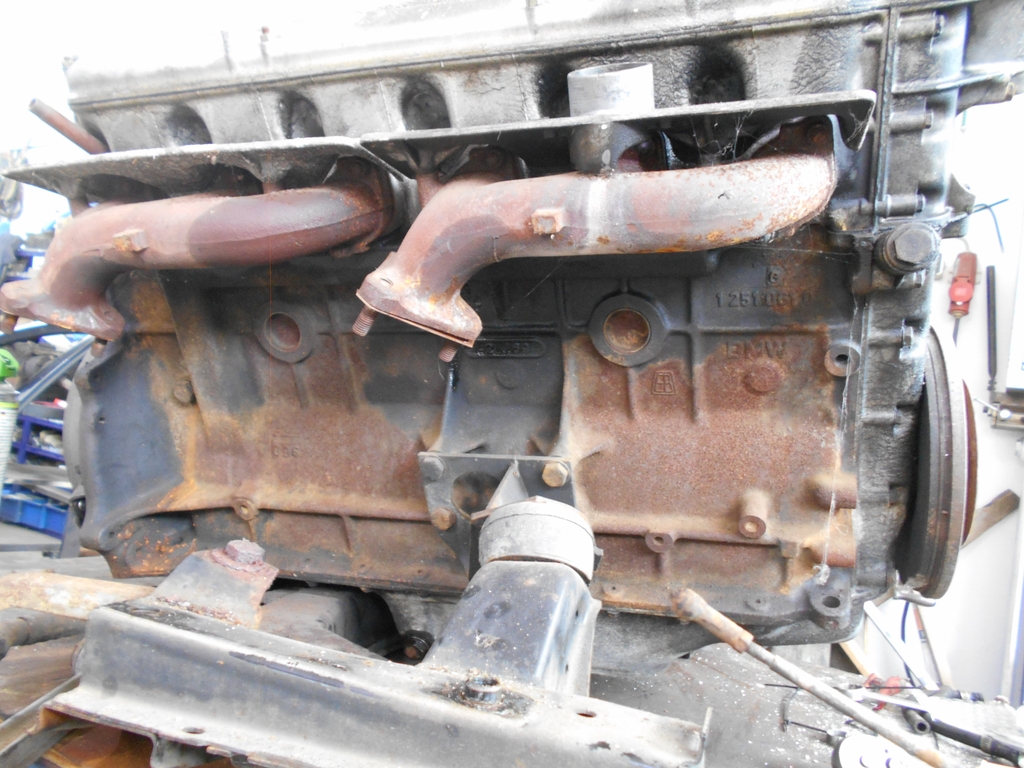 Vorderachse Fahrerseite, Träger mit Radführung und Lenkung. Das Lenkgetriebe ist sehr schwarz und schmutzig. Der Achsträger ist hin. Hinterachse von oben, links ist links. Der Prestigeartikel "Stabilisator hinten" ist sichtbar vorhanden. Grund zum Mißtrauen besteht dennoch. Fiel uns erst später auf, mehr dazu ein andermal. Triebwerk Auslaßseite. Guß- und Schlagmarkierungen lassen annehmen, daß es sich um die originale Maschine handelt. Gut zu erkennen ist der frühe Block ohne die Taschen für den 3.3 L. Bald mehr.