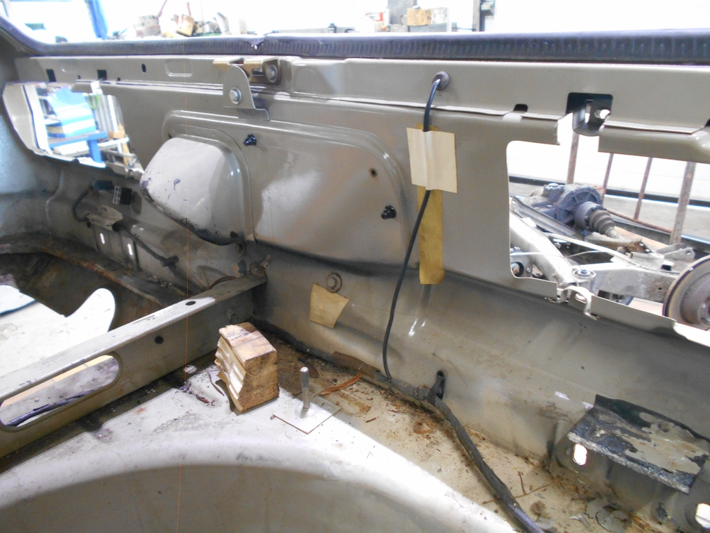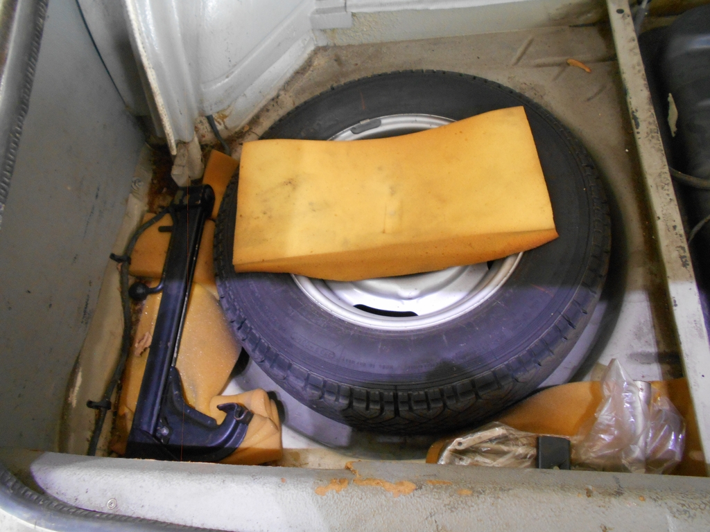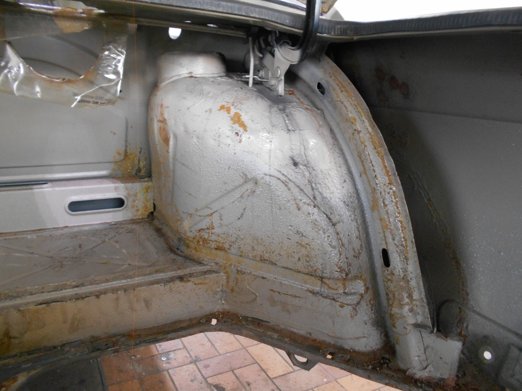Kofferraum, Ecke hinten links. Deutlich sichtbarer Effekt des Schaumstoffs unter dem Wagenheber. Seitenwand im Auslieferungszustand, dünn und völlig glatt lackiert. Kofferraum, Radhaus rechts. Reparaturschweißung am Radhaus, wie auch auf der anderen Seite. Reparaturblech für Radlauf eingesetzt. Wenig gut zu erkennen: Seitenwand nachlackiert, Oberfläche mit grober Struktur. Kofferraum, Heckblech. Die Blende ist noch am Fahrzeug: schwarze Schrauben & Muttern an der Ausbuchtung für Tankklappe und -verschluß. Die Führung der Leitung für die Kennzeichenleuchten zu betrachten, macht einfach Freude. Soviel zum Kofferraum. Anderes demnächst.