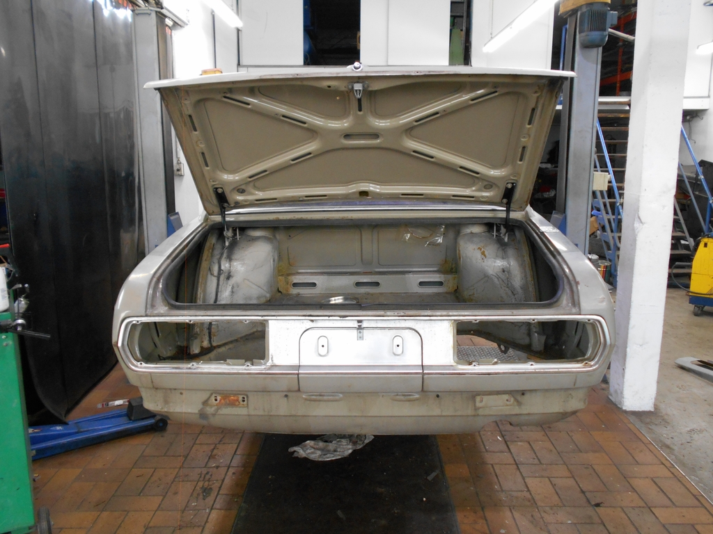 Kofferraum Fahrerseite. Was für ein Anblick, fast zu schön zum Ausräumen. Links außen liegt der Kabelstrang zu Tank und Rückleuchten. Die Halteschlaufen sind ein schönes Detail und vor allem wiederverwendbar. Der Reservereifen ist ein Continental "D R 70 HR 14", DOT 166. In das Kronprinz-Stahlrad ist "9 69" gestempelt. Radhausverkleidungen Kofferraum Beifahrerseite. Erträglicher Zustand, die der anderen Seite sind kaum schlechter. Die beiden merkwürdig geformten Schaumstoffstücke im Bild links stammen aus den Ecken zwischen der vorderen Rundung der Radhäuser und der Kofferraumvorderwand. Beim Entfernen der eingeklebten Elemente sind lange Arme von ganz großem Nutzen. BMW 2800, Rückansicht. Die Leuchten ließen halbwegs gut ausbauen. Vielleicht haben sie es sogar überlebt. Der Tank wäre ohne die guten zehn Liter Kraftstoff drin sicher einfacher herauszuholen gewesen. Das fröhliche Nevada auf der Innenseite des Kofferraumdeckels macht richtig Lust auf die Restarbeit. Mehr, wahrscheinlich mehr Kofferraum, demnächst.
