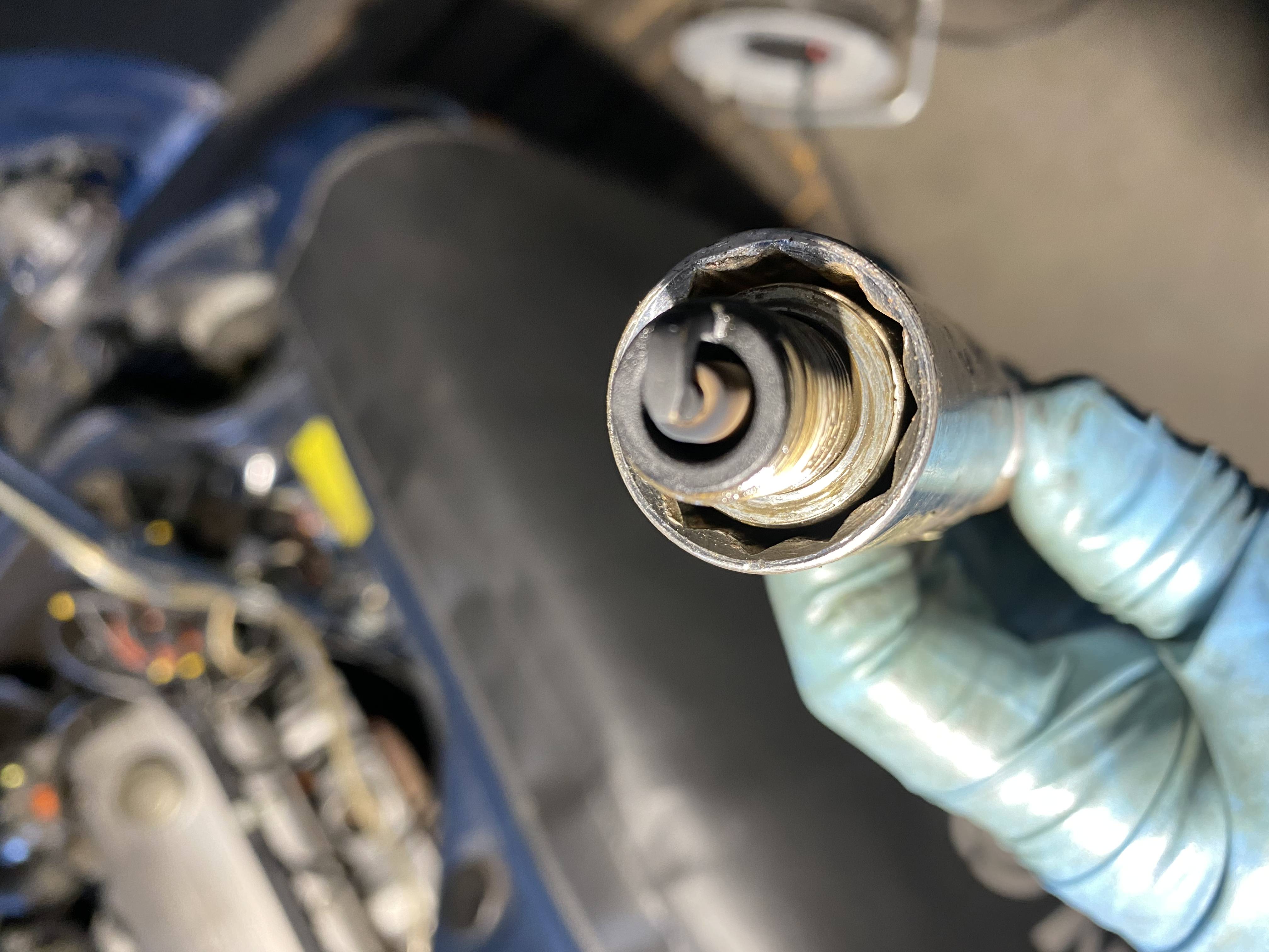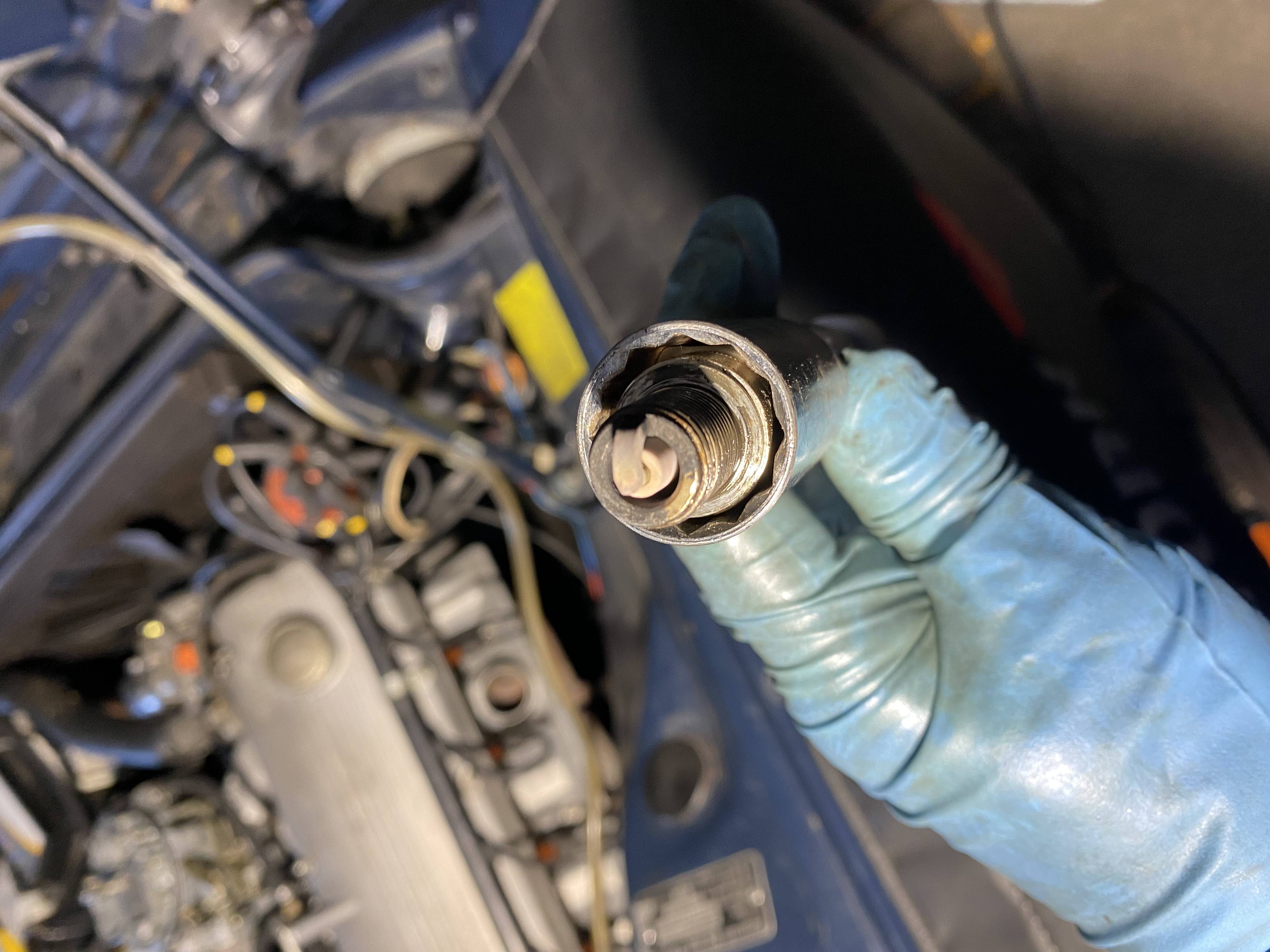 Nun wollte ich gestern mal nach der Ursache forschen und habe zunächst die Freigängigkeit des Gasgestänges geprüft. Alles soweit i.O., so dass ich den Wagen gestartet habe. Bei Start kam kein stabiler Leerlauf zustande, der Motor lief extrem unrund und musste mit Gasstößen am "Leben" erhalten werden. Es hörte sich so an als lief der Motor nicht auf allen Zylindern.Ich habe mir darauf hin die Zündanlage angeschaut. Der Verteiler und die Kabel waren optisch i.O. und die Zündkerzen auch. Auffällig war, dass alle Zündkerzen schwarz (aber nicht verrußt) und leicht feucht waren.